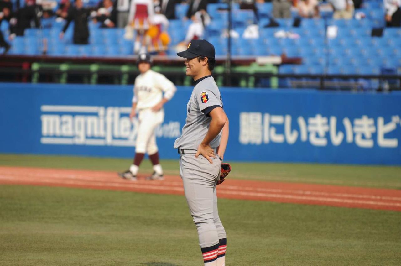 竹内大助君はやはり、2年生の春から今までずっと初戦を任されてきたエースだなと思いました。常にランナーを背負う場面が続きましたが、大事なところで決定打を打たせない、ある意味大助君らしい投球でした。もしかすると、彼はどう投げるとかが問題ではなく、相手との間合いをどのように制するかが大事な投手なのかなと今さらながら思いました。強く感じたのは3回裏、同点に追いつかれ尚も2死満塁。打者は今春当たっていた1年生の茂木君。茂木君は初球からバットを大助君に向けて「おりゃ〜!」みたいな奇声を上げて構えていました。1年生が4年生に取る態度かどうかは別にして、なかなか元気の良いことです。しかし、自分が思うにもこれはこの慶早戦独特の雰囲気に押し潰されないため、敢えて声を出しているように見えました。それを竹内大助君もきっと察知したのでは無いかと思うのです。うまく相手の打ち気を削ぎ、結果はタイミングのずれた空振りの三振を取っていました。フォームも大事ですが、原点に戻って相手の表情をよく見ることこそが、竹内大助君の好投の秘訣かもしれませんね。
